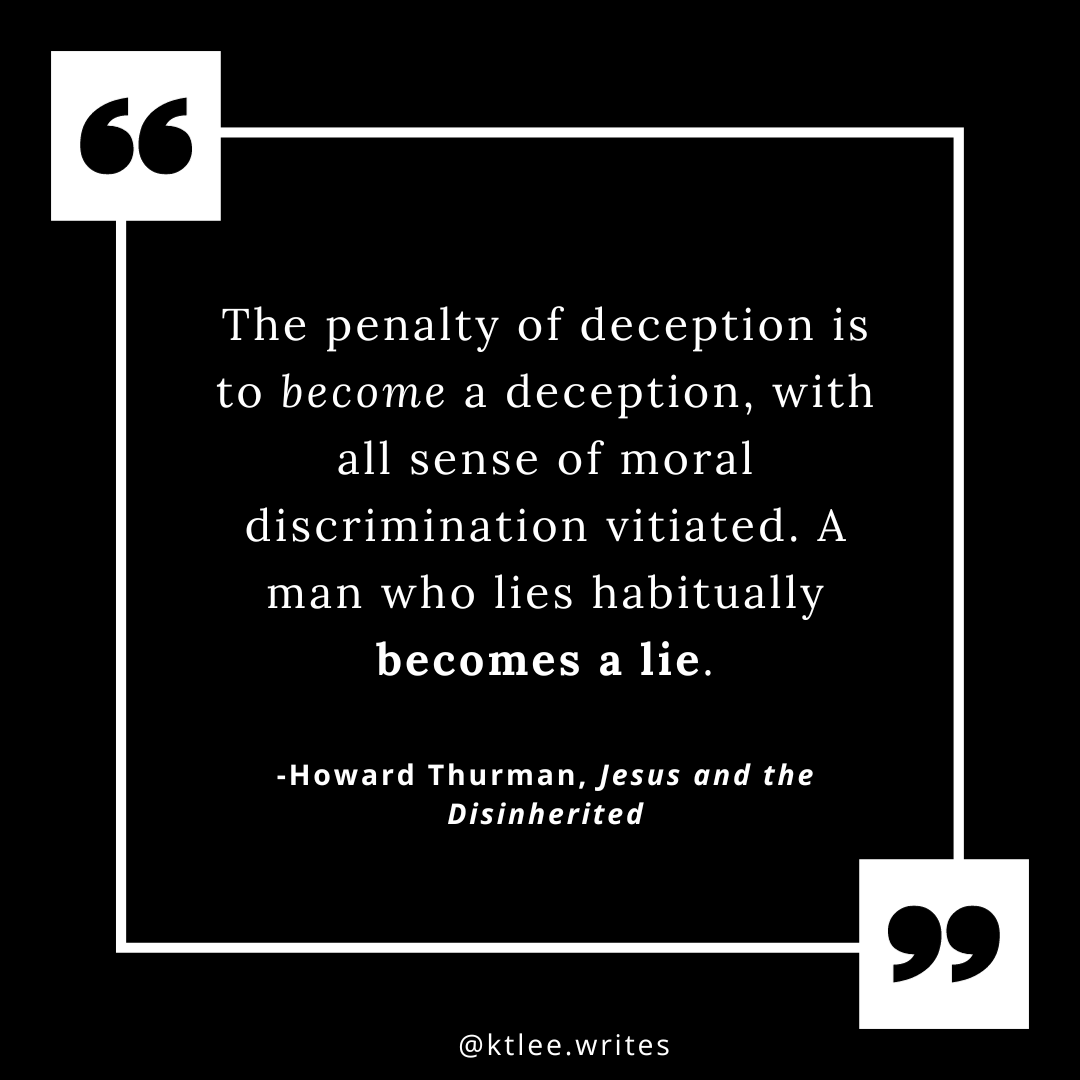 While Thurman understands why the disinherited turn to deception (how can there be honesty where there is no real community?), he counsels that practicing deceit numbs our sense of morality.