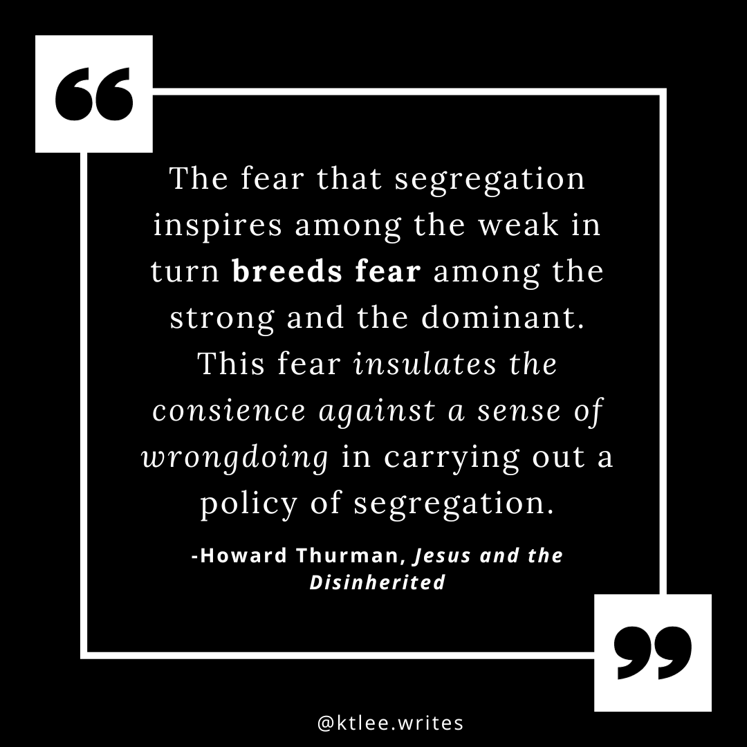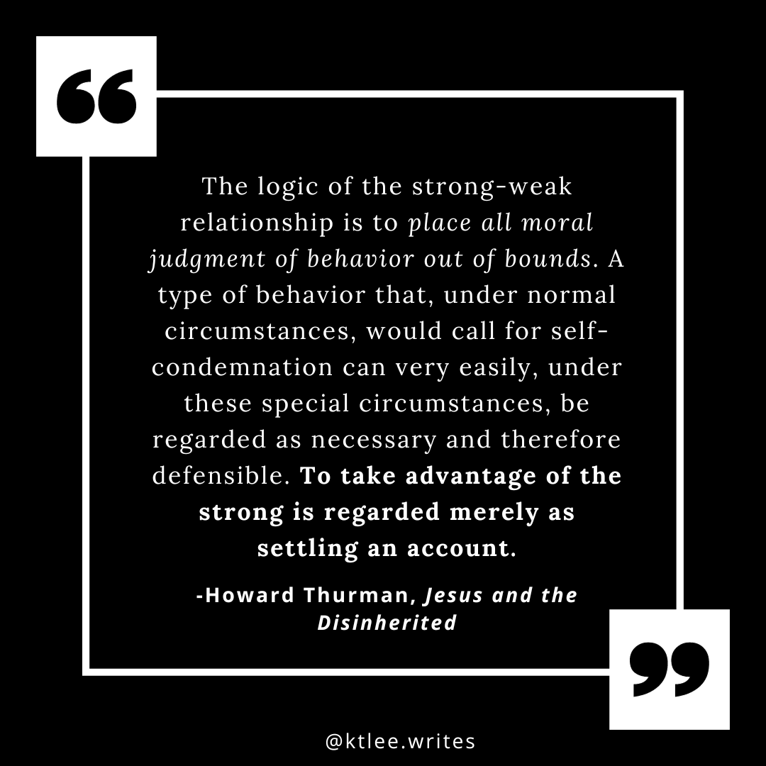 The cynical side of me finds this awfully hopeful, for wouldn’t the dominant just crush the weak in this scenario? Yet Thurman writes not about what frees the dispossessed from the yoke of human oppression, but from the internal rot of moral dissolution.