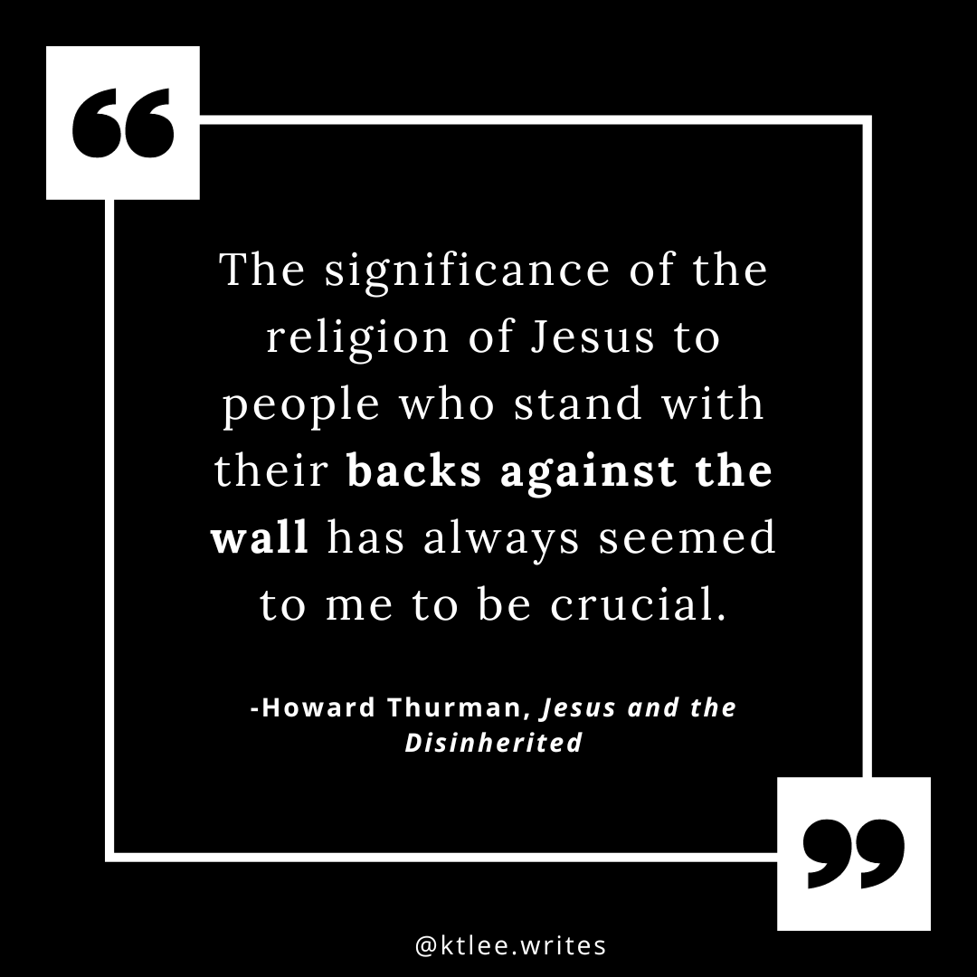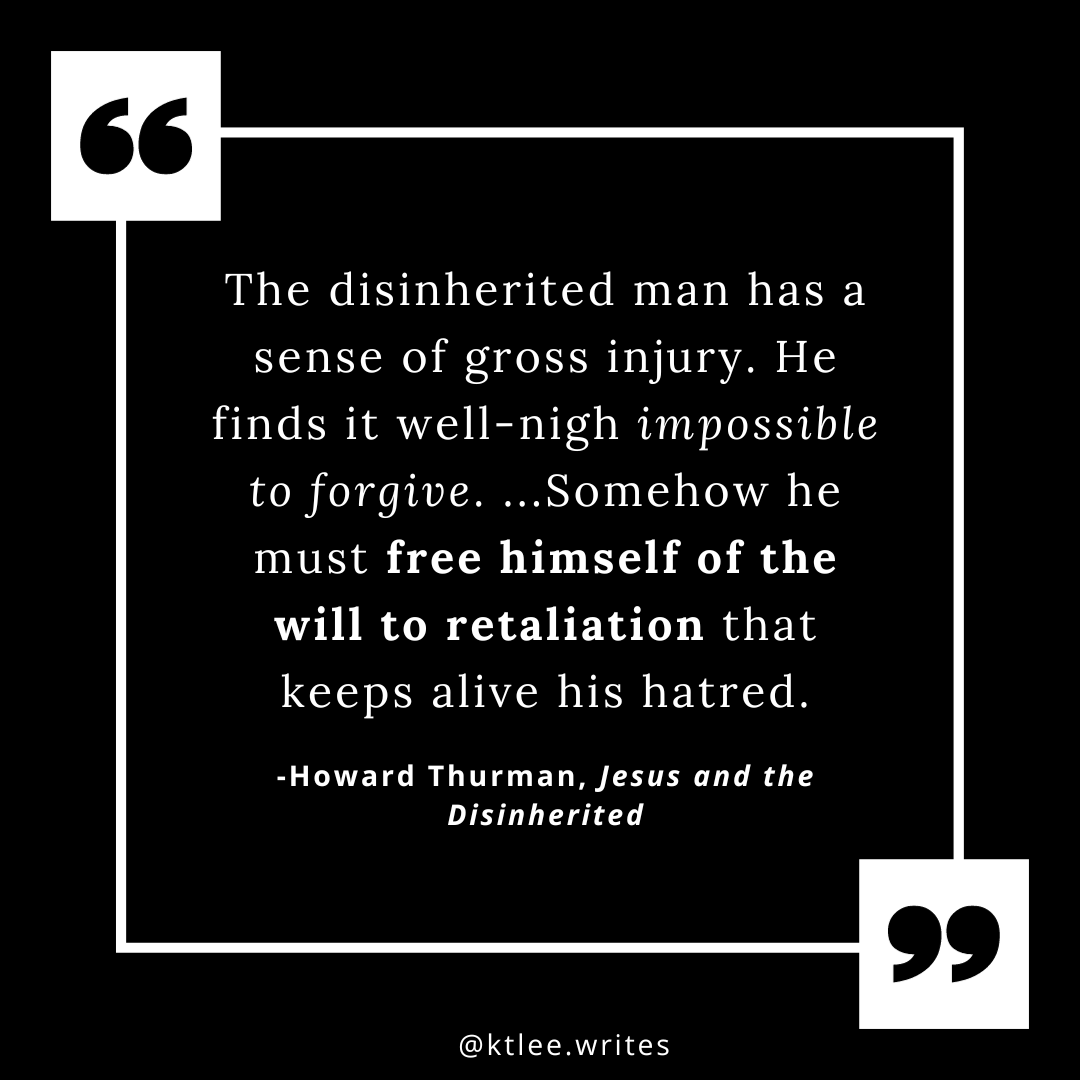 Why is the onus on the disinherited to be the bigger person, to recognize the image of God in their oppressor, and to forgive? Thurman isn’t letting the oppressor off the hook, but in this manifesto he is specifically tests out how Jesus is germane to the dispossessed. Let others preach to the oppressors.