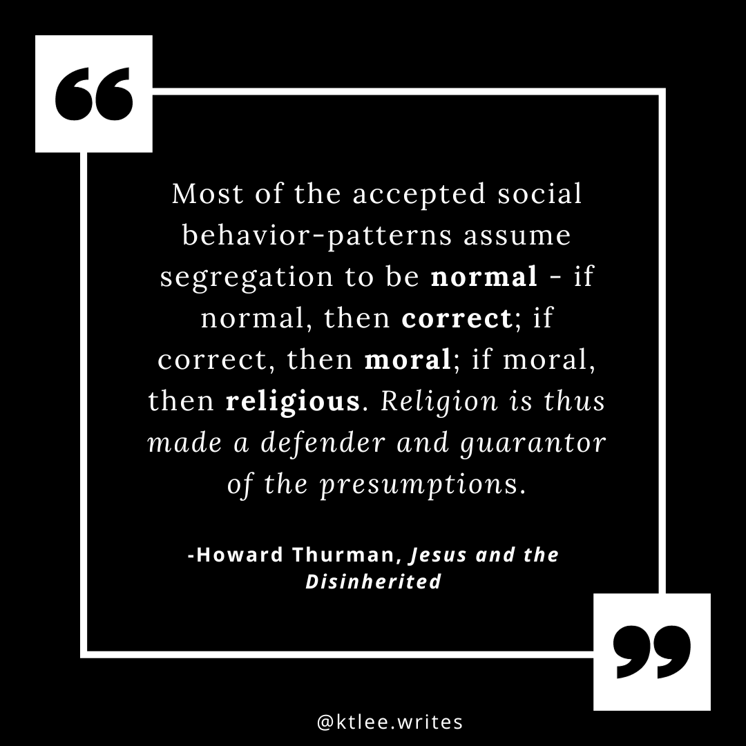 Thurman is adamant that the arrangements of power in this world are very wrong. In his day, the situation at the forefront was segregation in the U.S., but he also draws attention to other unequal structures such as the caste system in India or the colonization of Korea by Japan. What I find interesting, though, is that he doesn’t let underlying injustice color our moral equations.
