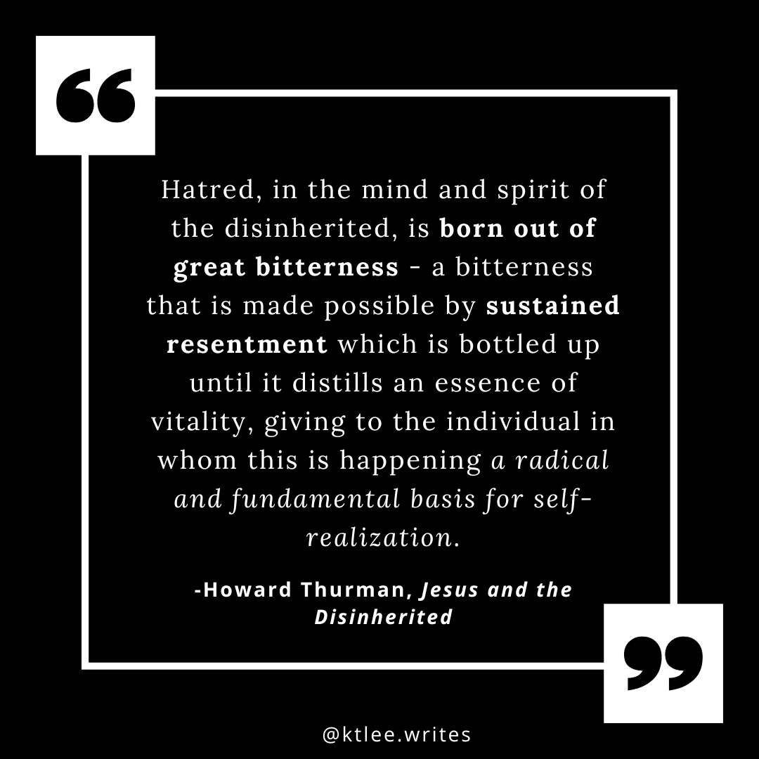 Yet even in 1949, Thurman counsels that “hatred destroys finally the core of life of the hater. …Hatred bears deadly and bitter fruit. …The logic of the development of hatred is death to the spirit and disintegration of ethical and moral values.”